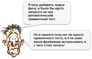 Надеюсь, этот пример был вам полезен! Он демонстрирует довольно типичную ситуацию — “Я хочу добавить новую фичу, и было бы круто написать на нее автоматический приемочный тест, но в проекте пока нет ни одного приемочного теста, и я не знаю какой фреймворк использовать и с чего стоит начать”.
