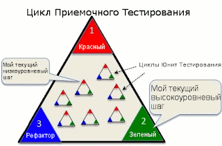 Для каждого цикла написания приемочного теста (на уровне новой функциональности), мы делаем несколько циклов написания юнит тестов (на уровне классов и методов).